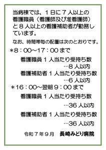 患者様が安心して過ごして頂ける病院として、又ご家族の皆様にも信頼して頂ける医療と介護の提供できる施設として、スタッフ一同看護、介護に当たっています。